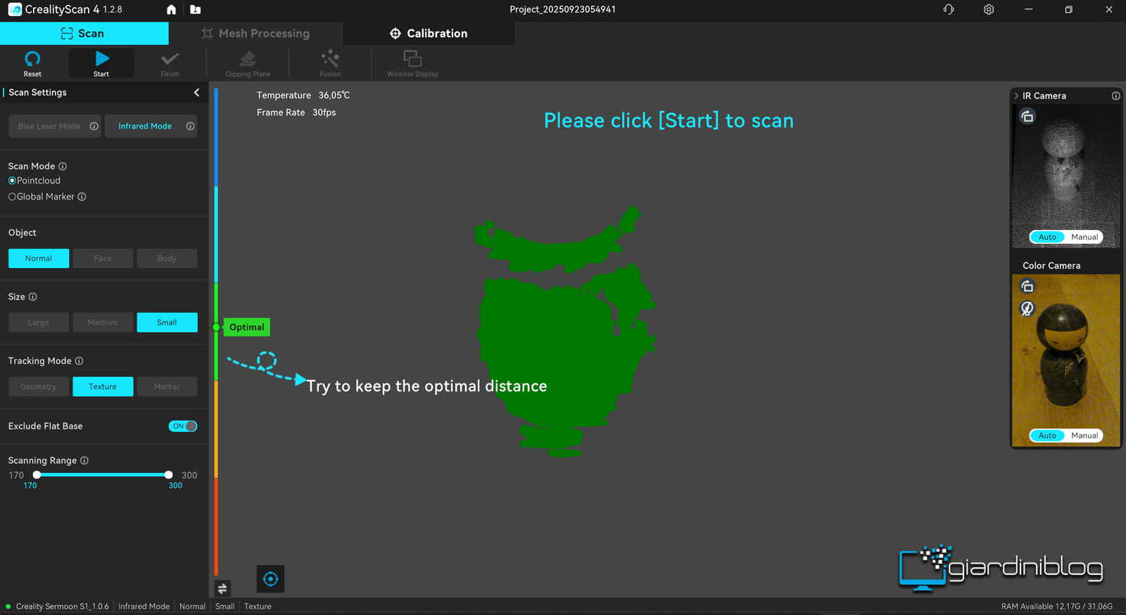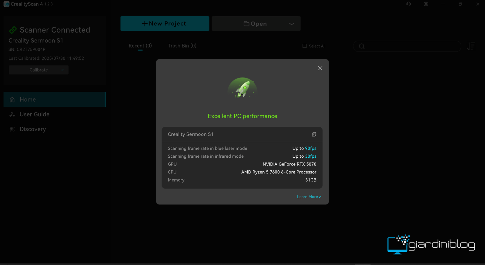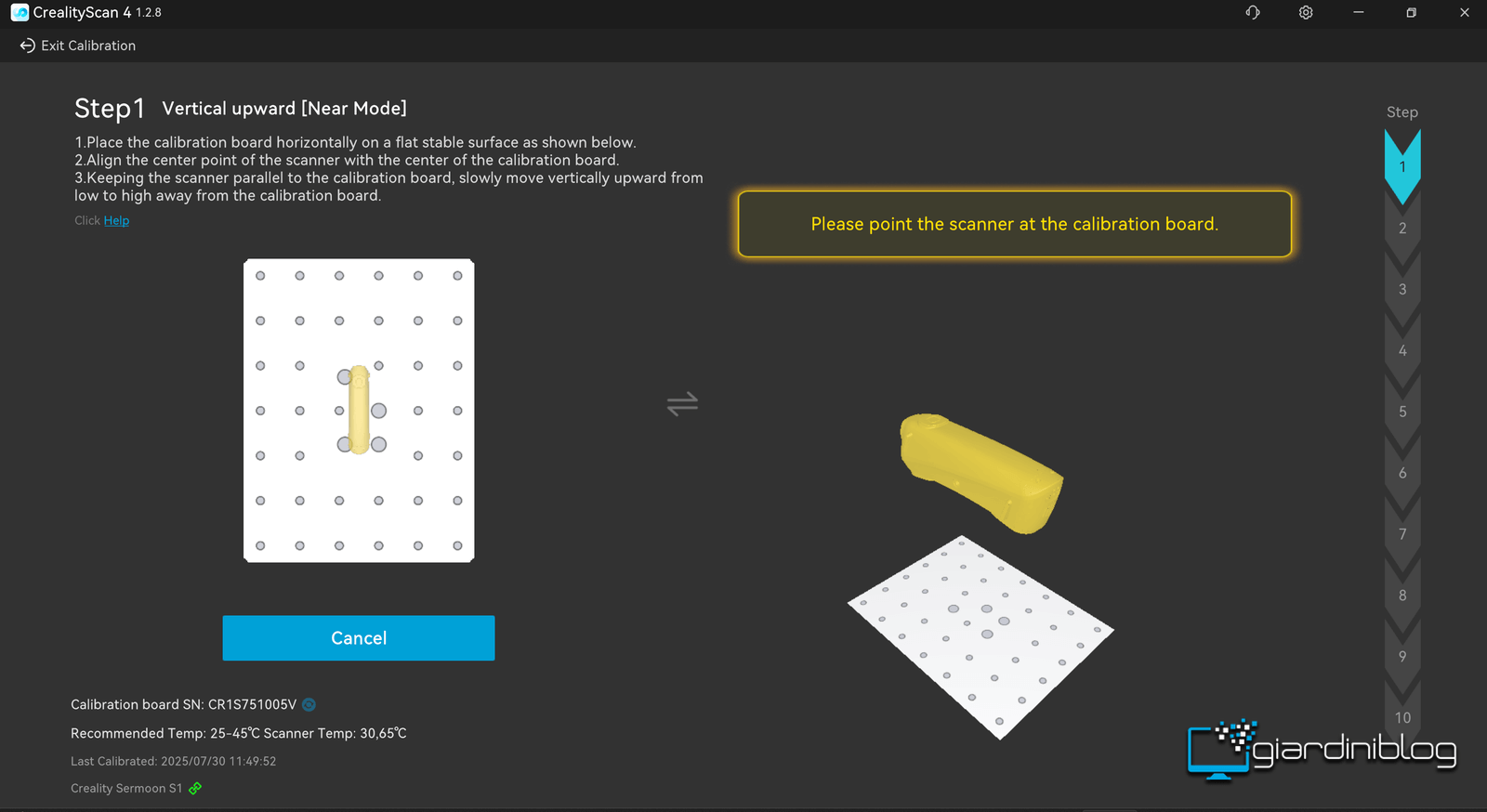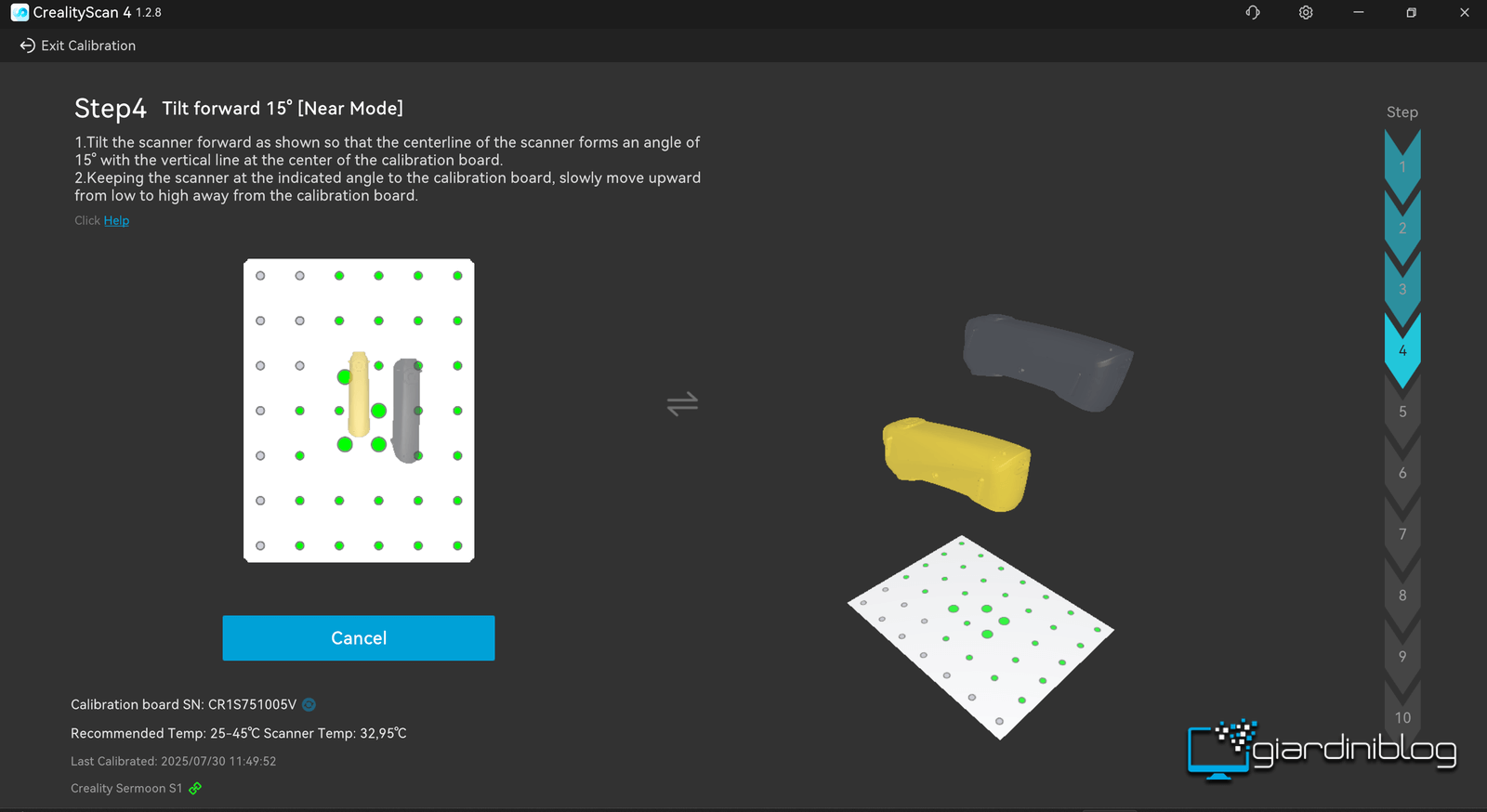 Il passo fondamentale di tutto il processo è stata l’installazione del software Creality Scan 4 il programma ufficiale che consente di gestire completamente lo scanner 3D e le sue funzioni. Prima di iniziare con la prima scansione, il software stesso rileva l’ultima calibrazione effettuata (se è nuovo, sarà quella del produttore) e ci propone di farla per avere Sermoon S1 in perfette condizioni.