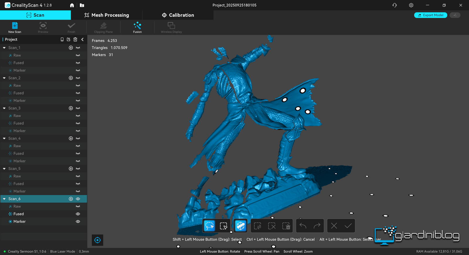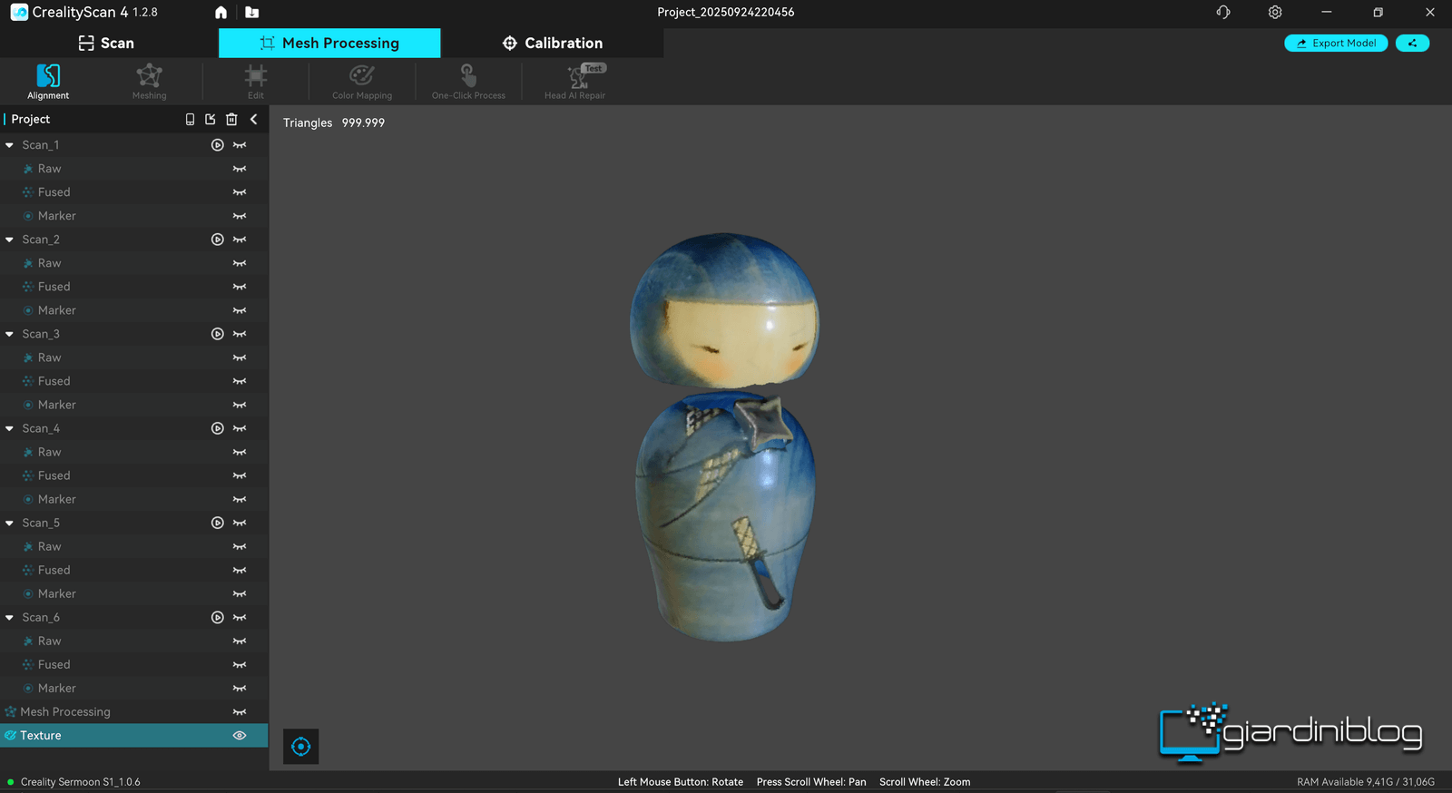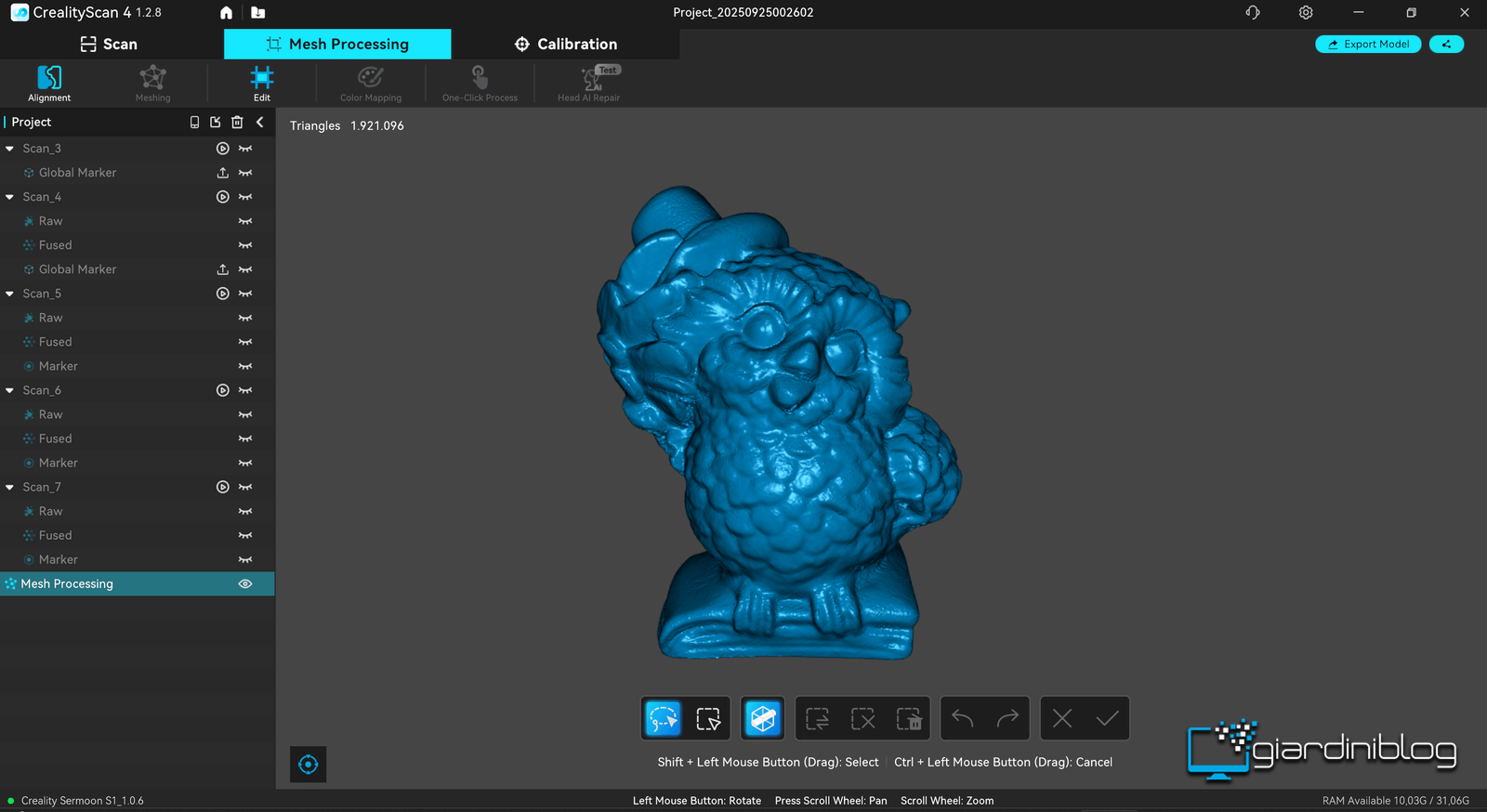 Creality Scan 4 ha facilitato moltissimo il lavoro grazie all’allineamento automatico delle scansioni multiple, che ha permesso di fondere efficacemente le diverse nuvole di punti in un unico modello coerente. Anche in questo caso è stato possibile selezionare aree da rielaborare con risoluzioni più alte e applicare tecniche di smoothing e pulizia della mesh per ottenere la migliore qualità possibile prima dell’esportazione. La mesh finale è composta da oltre 8 milioni di triangoli, un livello di dettaglio che riflette la complessità e la ricchezza della figura scansionata e che consente di usarla in ambito professionale o dove è richiesta alta precisione.