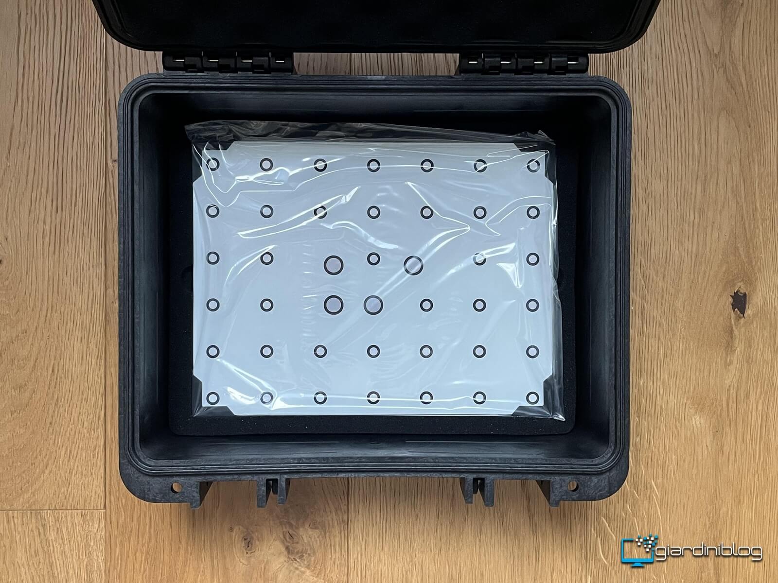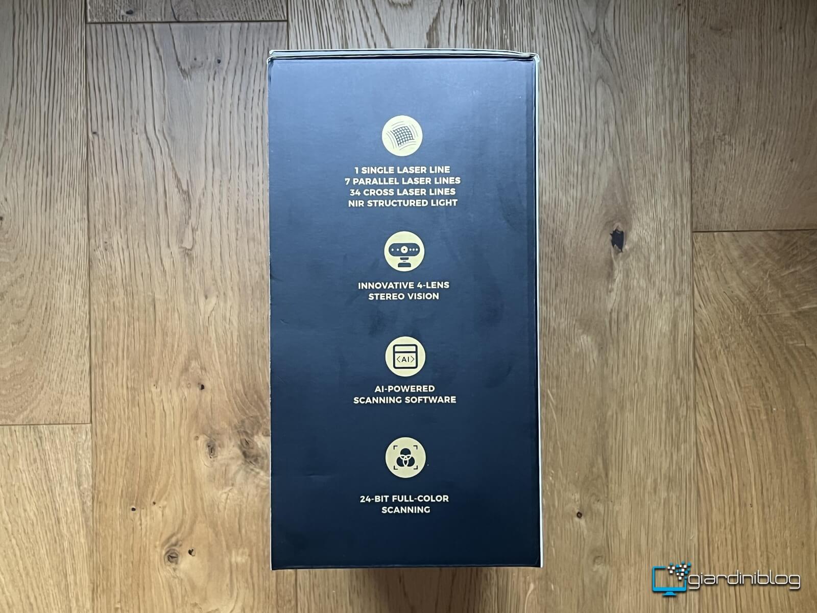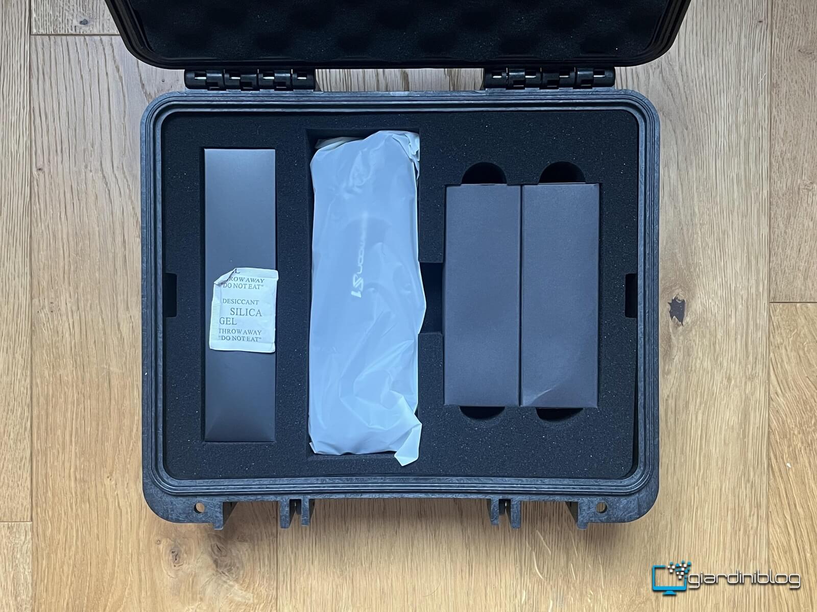 Aprendo la custodia rigida ci troviamo davanti allo scanner 3D e gli accessori collocati in altri contenitori di cartone, con una schiuma che circonda ogni elemento. L’organizzazione interna della custodia è studiata nei minimi dettagli, con ogni componente che trova il proprio posto specifico, creando un effetto visivo molto professionale fin dal primo impatto.