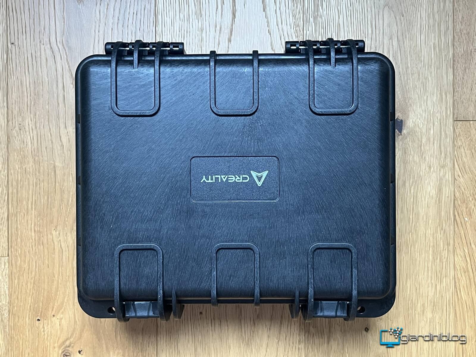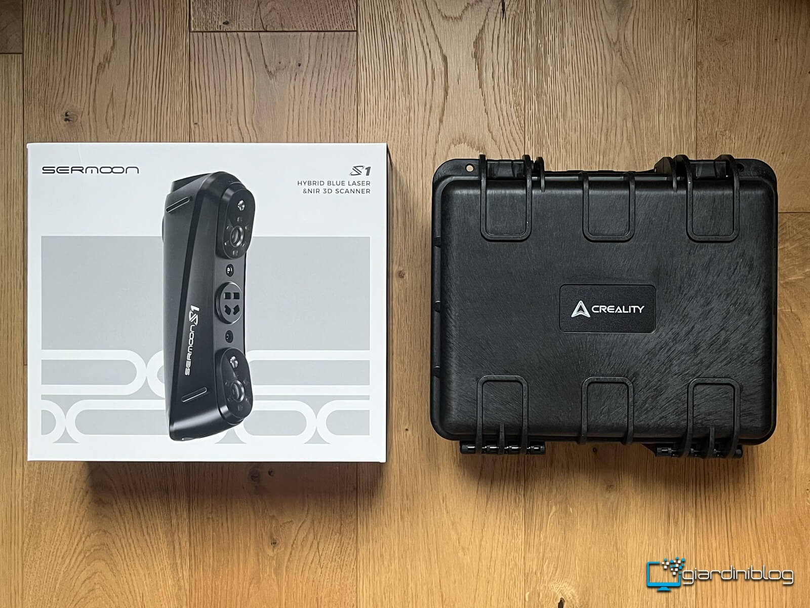 Partiamo con l’unboxing dello scanner 3D di Creality; l’esperienza riflette immediatamente il livello professionale dello scanner 3D. La prima cosa che salta subito all’occhio è la custodia rigida stile valigia, usata normalmente per apparecchiature professionali e strumentazioni che hanno bisogno di grande protezione. Sermoon S1 è in effetti un prodotto destinato ad un utilizzo intensivo e professionale, che spesso ha bisogno di essere trasportarto in giro, quindi una protezione adeguata è fondatamentale.