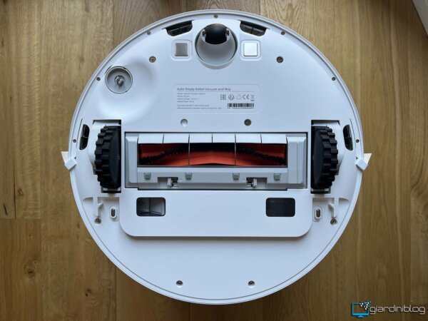 La parte inferiore ha la spazzola di pulizia principale che può essere rimossa per rimuovere capelli e residui, i sensori anticaduta e una spazzola laterale. I sensori vengono usati anche per evitare di rilasciare l’acqua per il lavaggio sui tappeti, in modo da lavare solo le zone che effettivamente lo richiedono.