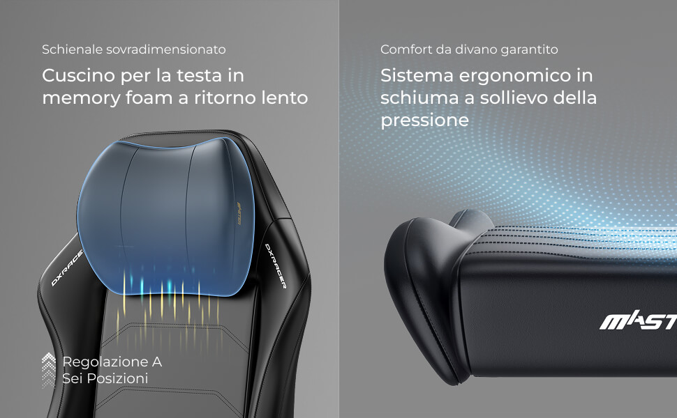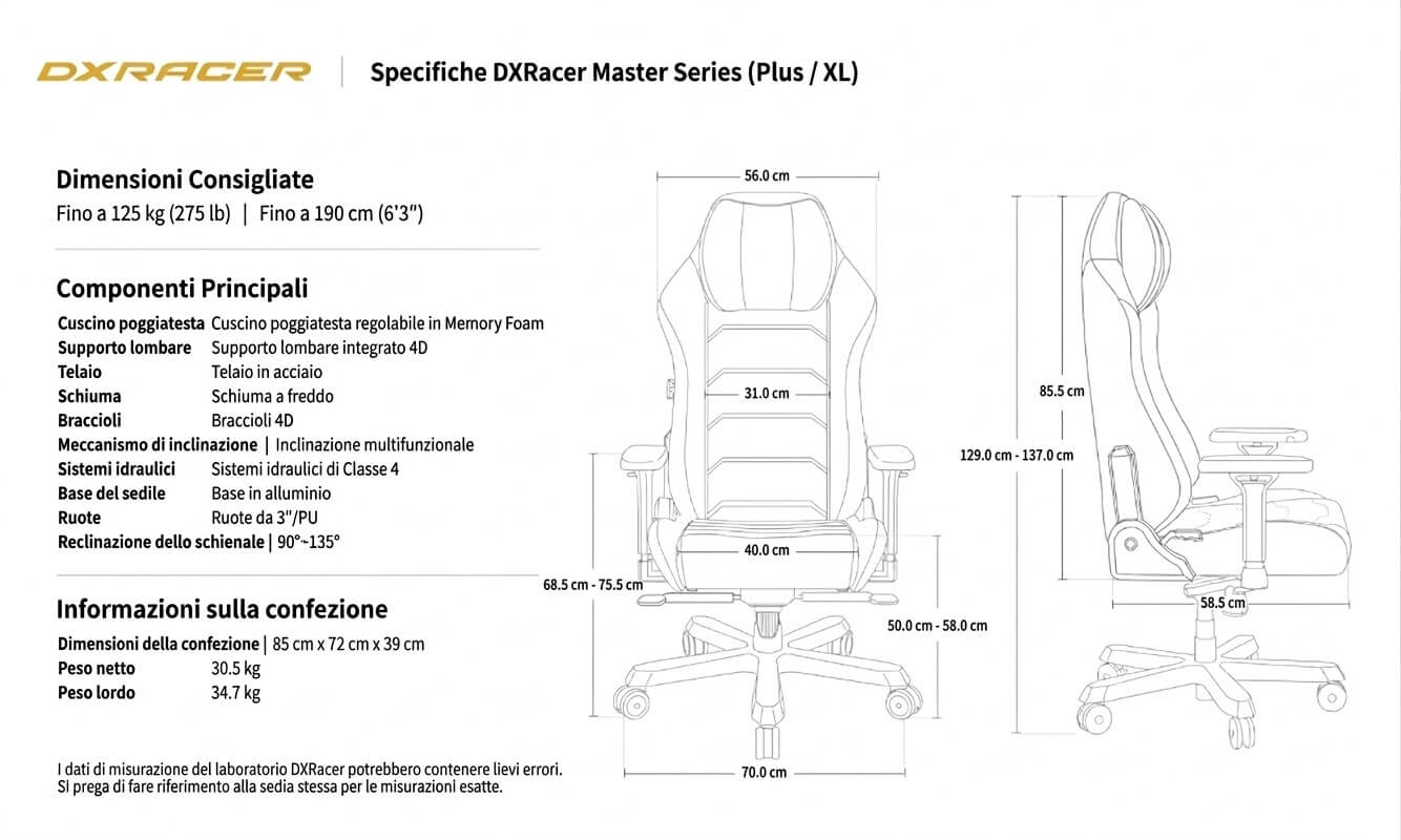 Di seguito tutte le misure, materiali e caratteristiche principale della DXRacer serie Master.