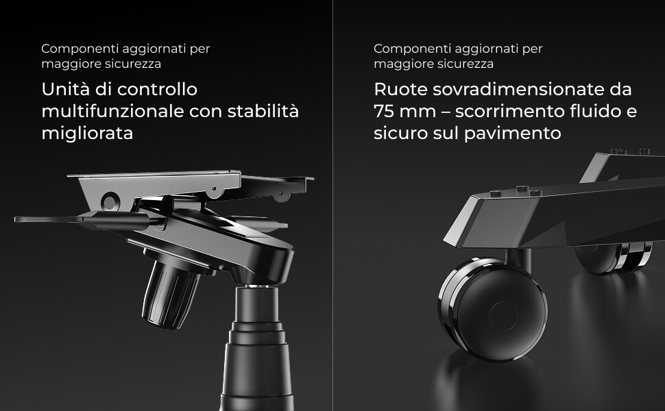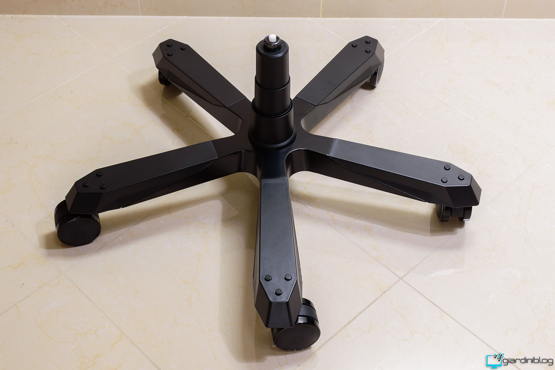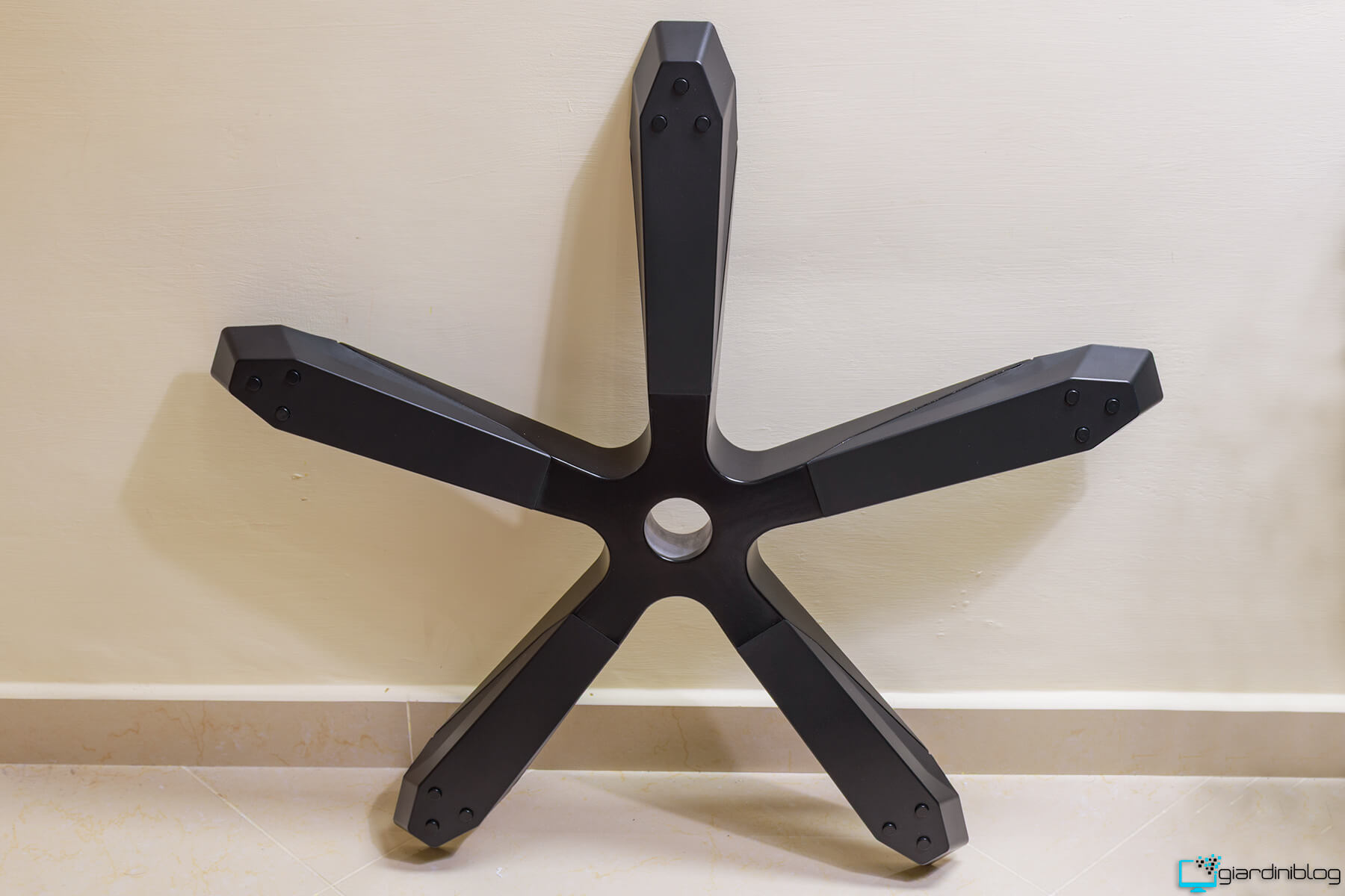 Sul piano costruttivo, emerge una forte attenzione alla solidità: il telaio interno in acciaio è robusto, la base in alluminio rinforzato garantisce stabilità e le componenti trasmettono una sensazione di compattezza già in fase di montaggio e utilizzo. Non si percepiscono elementi economici o fragili, e anche le parti plastiche hanno una funzione più estetica che strutturale senza compromettere la qualità percepita.