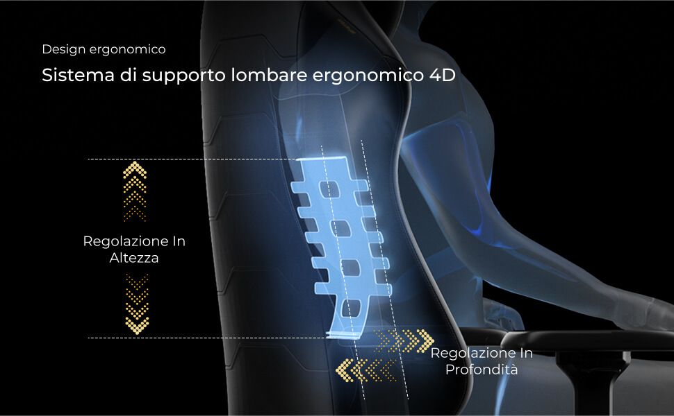 Dal punto di vista ergonomico, la DXRacer Master è progettata con un approccio decisamente più “tecnico” rispetto alla media delle sedie gaming. Il fulcro è il supporto lombare integrato 4D, regolabile sia in altezza sia in profondità tramite una manopola laterale, che consente di adattare con precisione la curvatura dello schienale alla propria colonna vertebrale, favorendo una postura corretta anche durante sessioni molto prolungate .