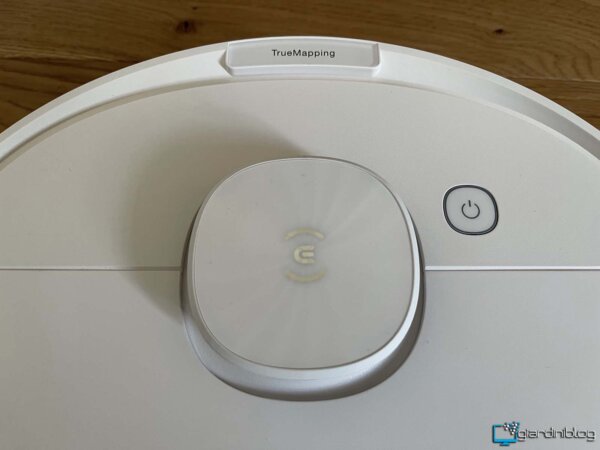 Una volta sollevato il coperchio, ci troviamo davanti alla vaschetta (rimovibile) che contiene la polvere e il filtro (lavabile) e ad uno switch per accensione e spegnimento, oltre ad un bottoncino per la connessione WiFi alla rete di casa. A coperchio chiuso, l’unico bottone visibile è quello per l’avvio delle operazioni di pulizia, che permette anche di mandare il robot alla stazione di ricarica.