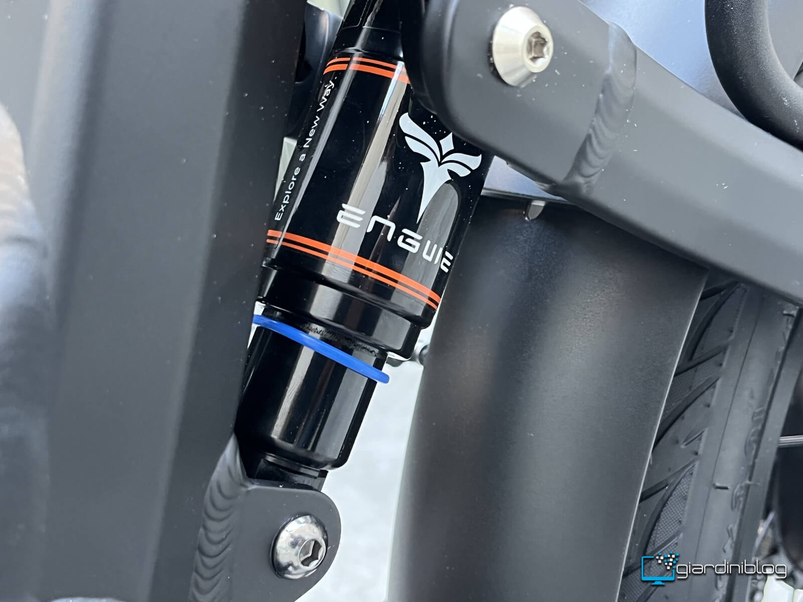 L’ammortizzatore posteriore, anch’esso di tipo idraulico risulta efficace nell’attutire i colpi e le vibrazioni provenienti dalle buche dell’asfalto urbano, dai dossi e dai marciapiedi. L’accoppiata tra sospensione completa, pneumatici morbidi e sella ammortizzata crea un sistema che attenua lo sforzo richiesto durante lunghi tragitti e si dimostra una scelta azzeccata per questa ebike.
