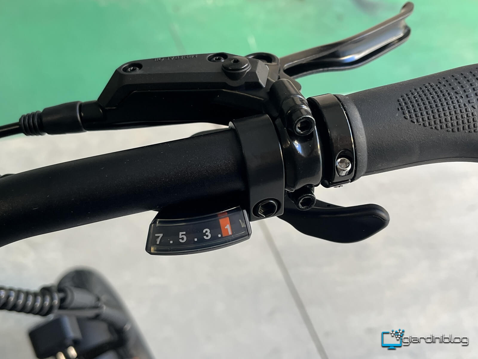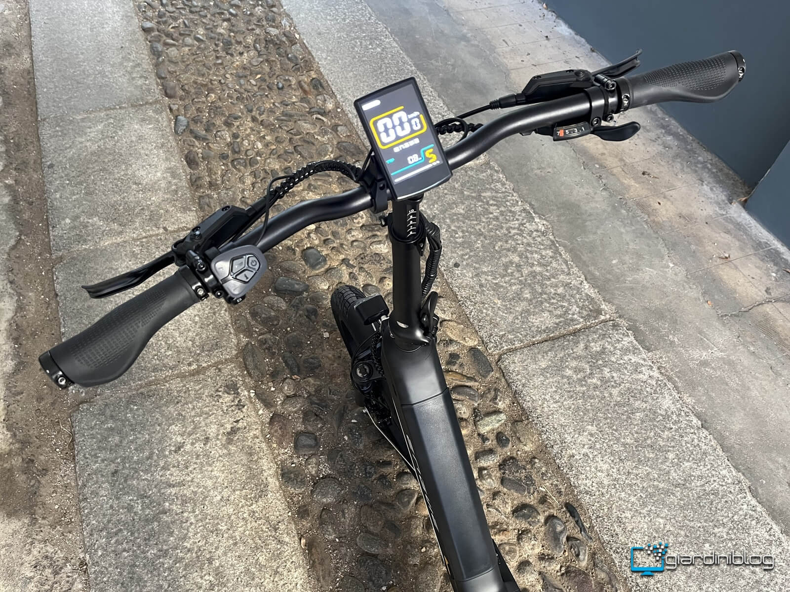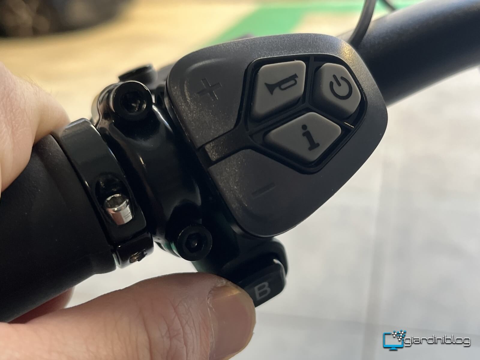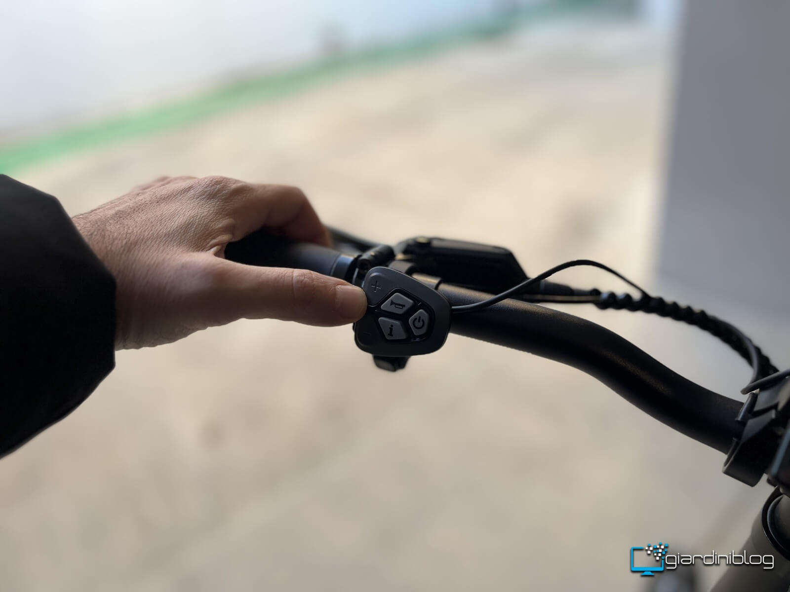 Tutti i comandi principali sono posizionati sul lato sinistro del manubrio: pulsante accensione/spegnimento, controlli per regolare il livello di pedalata assistita (+ e -), clacson elettronico integrato, accensione dei fari anteriori e posteriori e il dedicato pulsante Boost. Premendo il tasto meno per alcuni secondi è possibile attivare la modalità walk assist che limita la velocità a 6 km/h agevolando il trasporto manuale della bici in situazioni critiche.