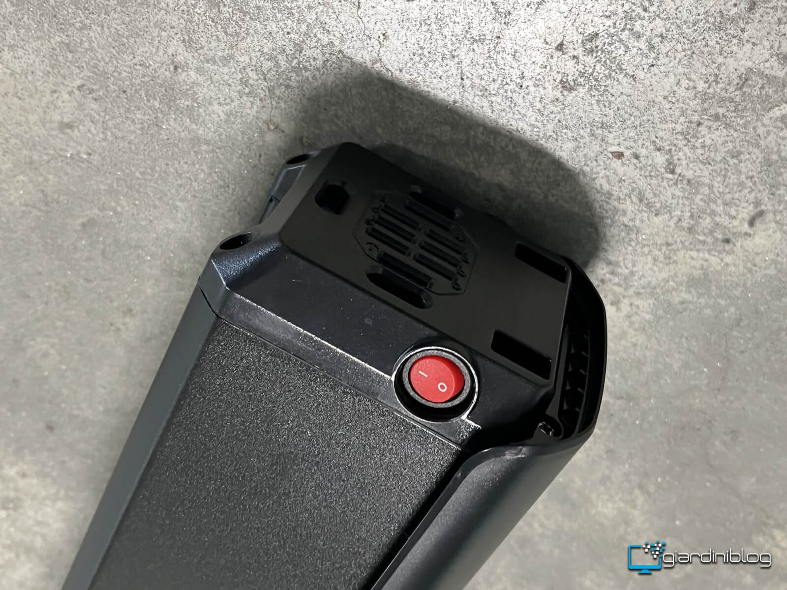 Questa caratteristica rappresenta un vantaggio pratico notevole: l’utilizzatore può facilmente estrarla e caricarla a casa, in ufficio o presso qualsiasi presa elettrica standard, indipendentemente da dove sia parcheggiata la bici. La batteria risulta abbastanza agevole da trasportare e installare anche per utenti meno robusti. E’ dotata di un bottone on/off accessibile solo una volta rimossa dall’alloggiamento e che funziona come sistema di sicurezza, come già detto più sopra in questa recensione.
