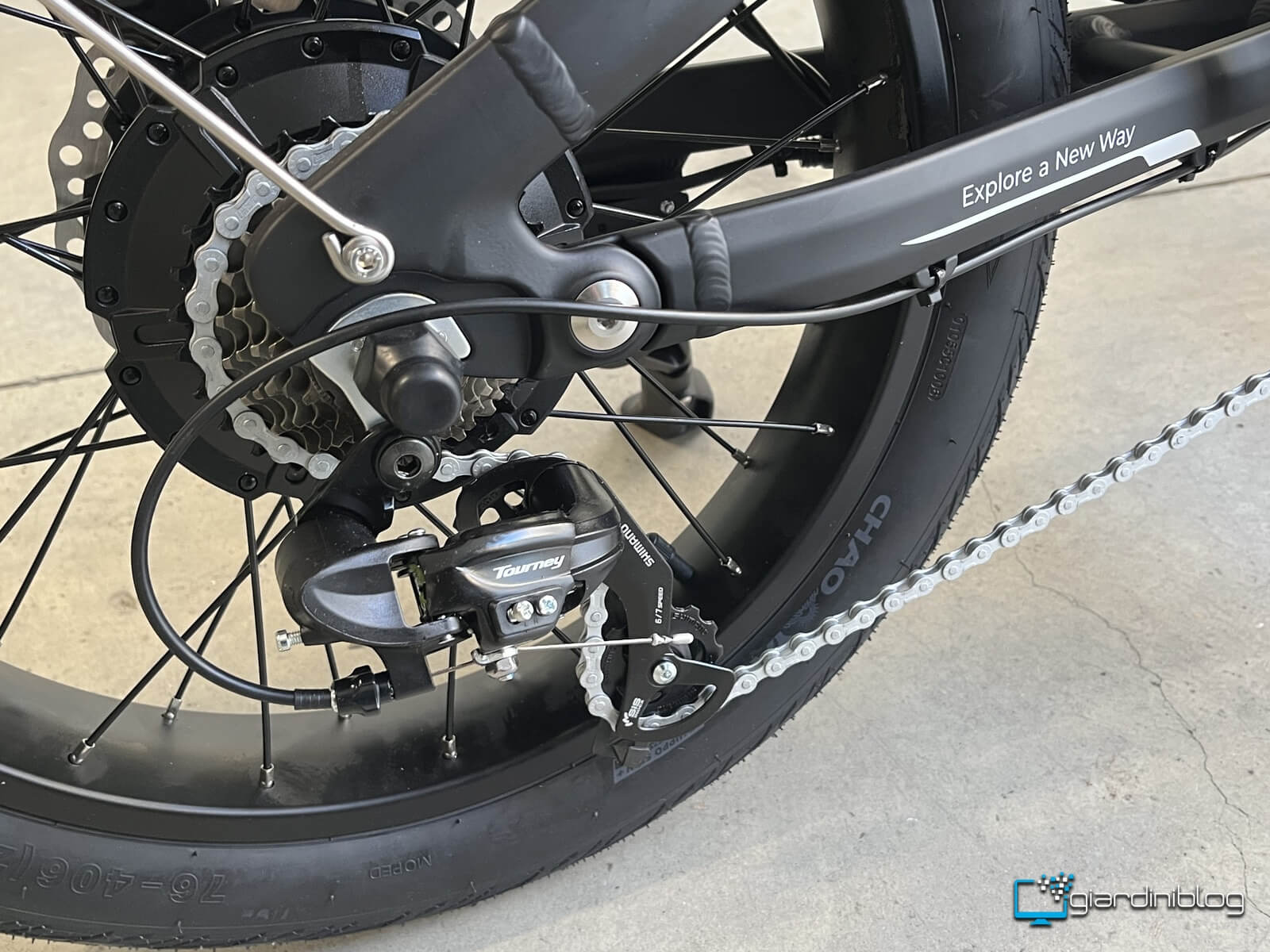 Il cambio di cui è dotata la bici è Shimano Tourney a 7 rapporti che consente di modulare la progressione della pedalata attraverso sette marce ben proporzionate, facilitando il passaggio fluido tra i rapporti sia in salita che in pianura. Durante i test, l’uso dei rapporti risulta corretto sin da subito, senza la necessità di effettuare alcun tuning. Combinando questi sette rapporti con i cinque livelli di assistenza disponibili, praticamente disponiamo di una molteplicità di configurazioni di pedalata che permettono di adattare l’esperienza di guida a qualsiasi tipo di percorso e preferenza personale.