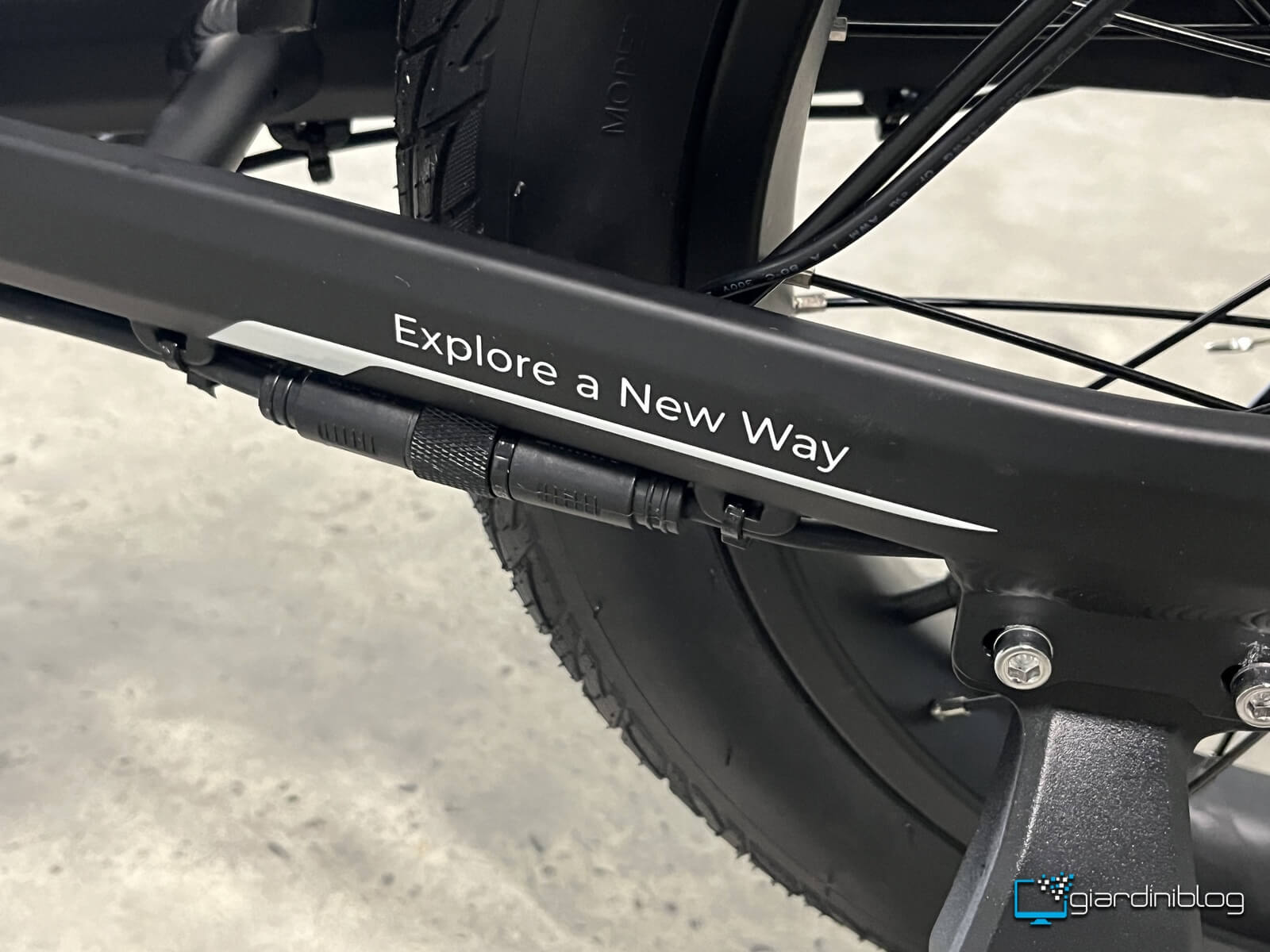 Infine, un elemento chiave del design funzionale è l’integrazione della batteria nel tubo obliquo: non solo contribuisce a mantenere il baricentro basso migliorando l’equilibrio di guida ma è stata progettata per essere rimossa con estrema facilità. Basta sbloccare la serratura per estrarre la batteria rendendo la ricarica in casa o in garage un’operazione rapida e senza complicazioni. Da notare che il bottone di accensione/spegnimento è situato direttamente sulla batteria e risulta inaccessibile quando la batteria è bloccata con la chiave di sicurezza, implementando così un meccanismo di protezione che impedisce l’avvio accidentale o non autorizzato della bici.