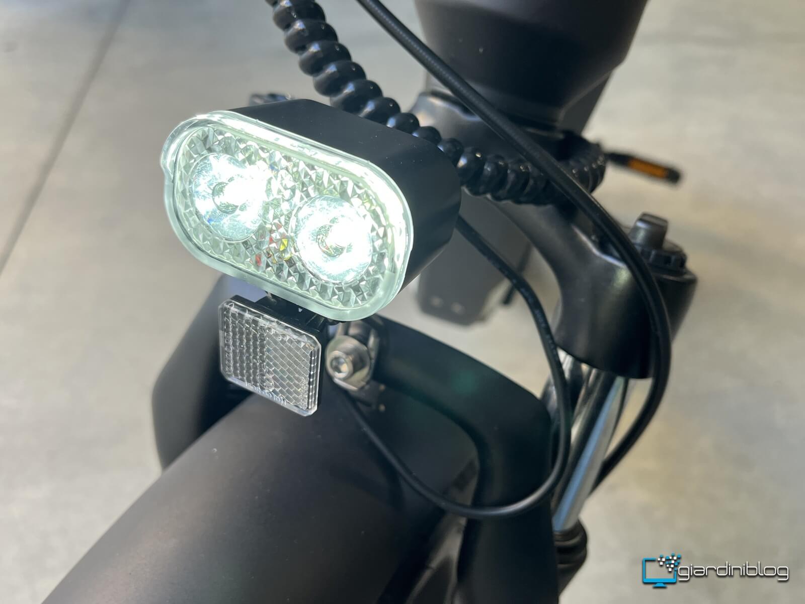 Tutto l’impianto di luci della L20 3.0 Boost è collegato al sistema elettrico, quindi si attinge dalla batteria principale, evitando le batterie separate per le luci che tendono poi ad esaurirsi in momenti diversi e inaspettatamente. Il faro anteriore ha una buona luminosità e garantisce una visibilità anche in condizioni di scarsa illuminazione o di notte.