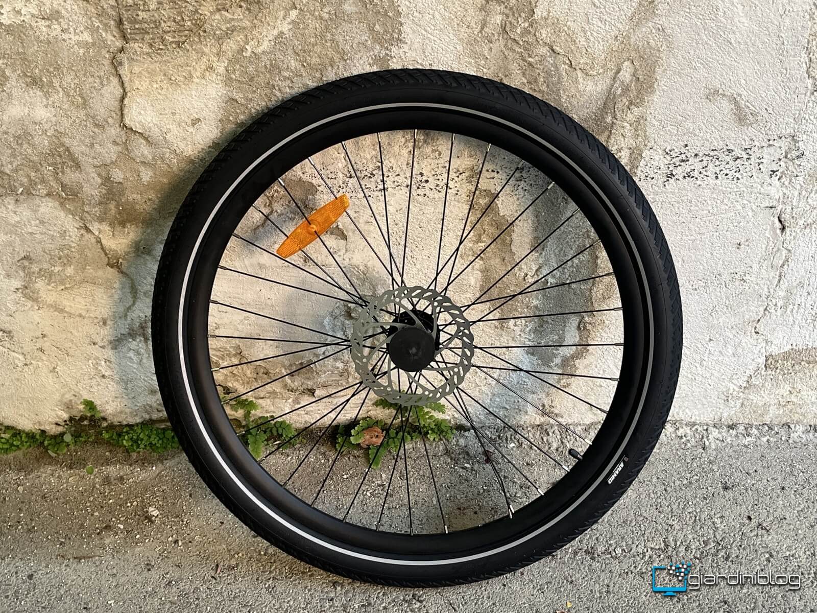 Le ruote da 27,5” con pneumatici da 1,95” di larghezza non sono FAT (come di solito vediamo per modelli di ENGWE) ma neppure super-compatte come quelle di molte ebike urbane convenzionali. Si tratta quindi di un compromesso per il modello P275 SE: garantiscono la fluidità su asfalto e allo stesso tempo, permettono di gestire brevi tratti in ghiaia o leggermente sterrati senza grossi problemi; presentano anche una striscia riflettente laterale che aiuta a aumentare la sicurezza durante la guida.