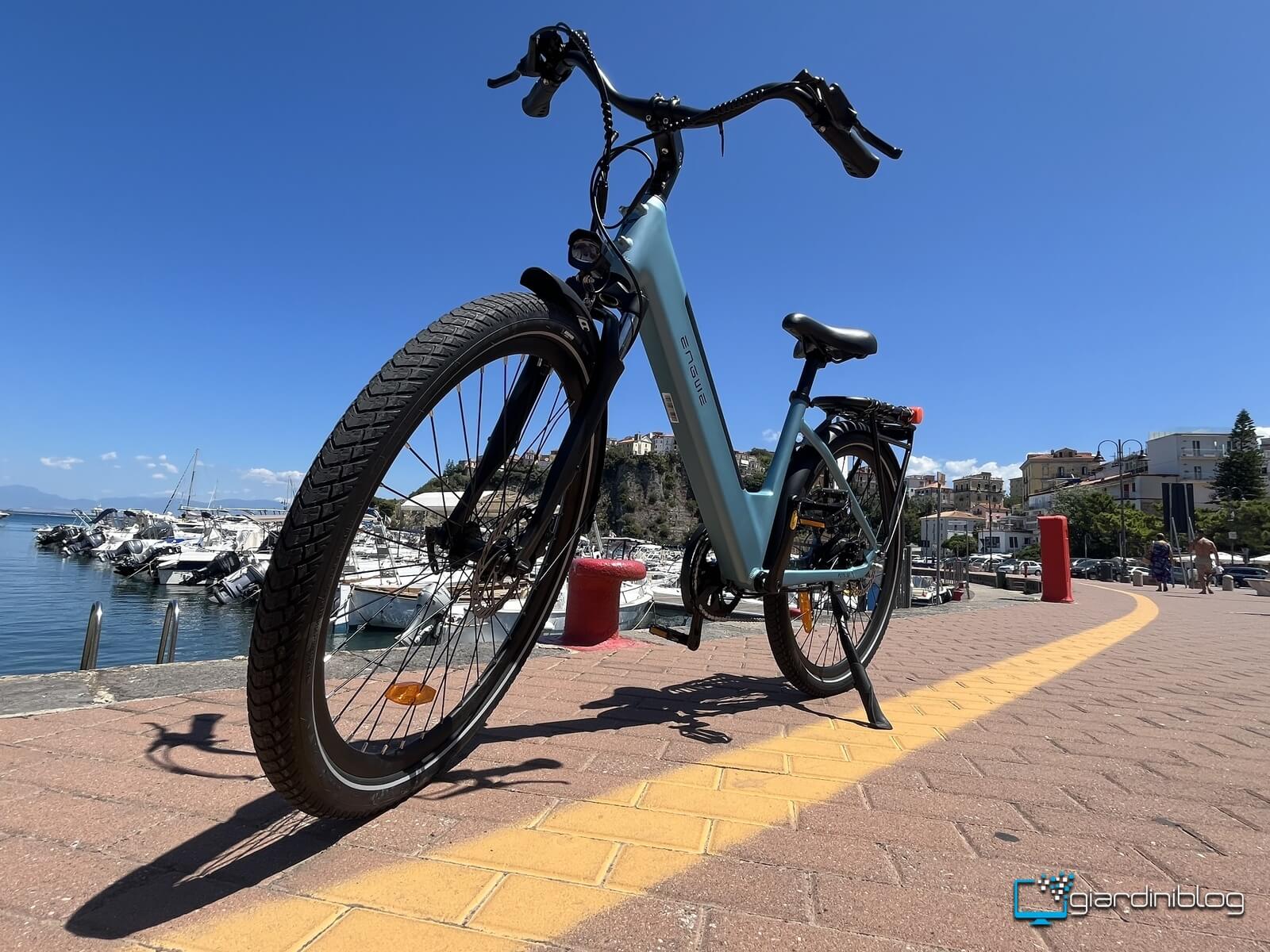 I parafanghi sono realizzati in plastica verniciata: non si macchiano facilmente e si puliscono rapidamente, fondamentale per una bici che potenzialmente deve affrontare strade umide e sporche. La loro copertura è completa, proteggendo adeguatamente durante l’utilizzo. Il cavalletto laterale è parecchio robusto e risulta capace di supportare la bici su superfici leggermente irregolari senza inclinarsi. Il portapacchi posteriore, che come detto ha capacità di 25 kg, riesce ad integrarsi nel design complessivo, con una struttura in acciaio inox che garantisce durabilità nel tempo.