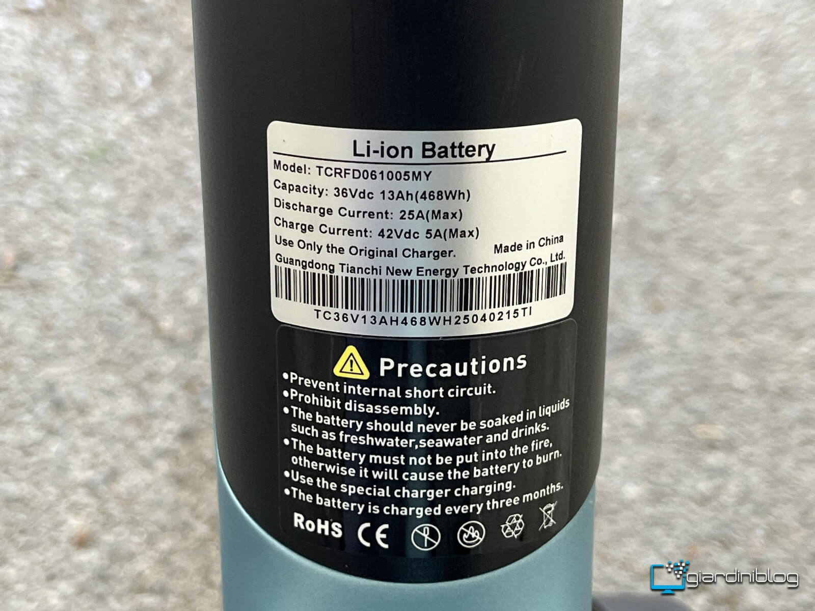 | Batteria | 36V 13Ah (468 Wh) rimovibile con doppia chiave |