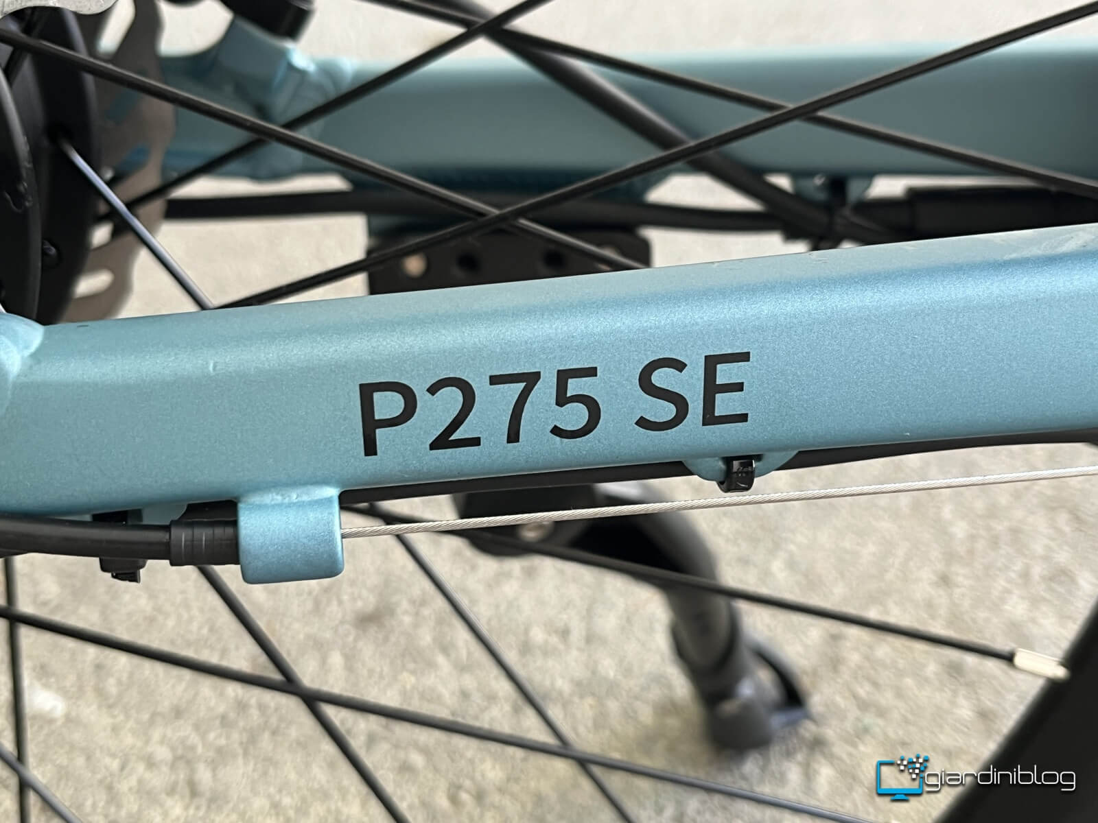 Parlando di peso assoluto, la P275 SE si attesta sui 24 kg (31 kg con batteria montata), cosa che potrebbe scoraggiare, almeno inizialmente; in realtà, in un contesto di guida e test reali, questo aspetto diventa importante anche perché usando la pedalata assistita, la leggerezza percepita è sempre ottima, quasi come se si guidasse ebike di fascia superiore e leggera. Anche senza pedalata assistenza, la ebike P275 SE resta molto pratica da pedalare, grazie all’equilibrio tra distribuzione dei componenti e trasmissione efficiente. Può trasportare fino a 120 kg e altri 25 kg sul portapacchi posteriore, dimostrando una solidità costruttiva che non limita la maneggevolezza.