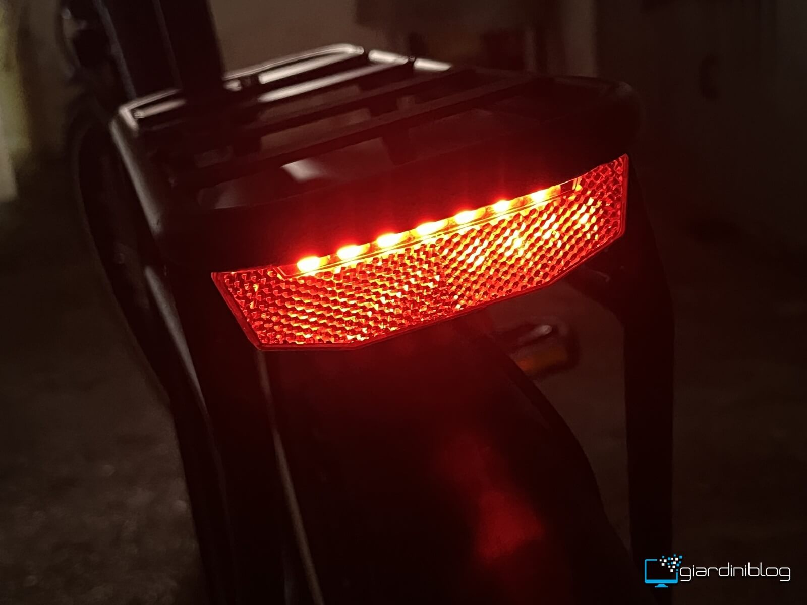 Il faro anteriore garantisce visibilità adeguata delle buche e degli ostacoli durante la guida notturna e anche la forma è leggermente arrotondata per conferire un aspetto esteticamente coerente. La luce posteriore, posizionata strategicamente nel portapacchi, svolge la funzione di luce di posizione continua oltre che di fanale durante la frenata. Un dettaglio interessante è che il sistema dispone di un sensore di frenata: quando viene azionato uno dei due freni, l’intensità della luce posteriore aumenta automaticamente, un avvertimento aggiuntivo per i veicoli che seguono.