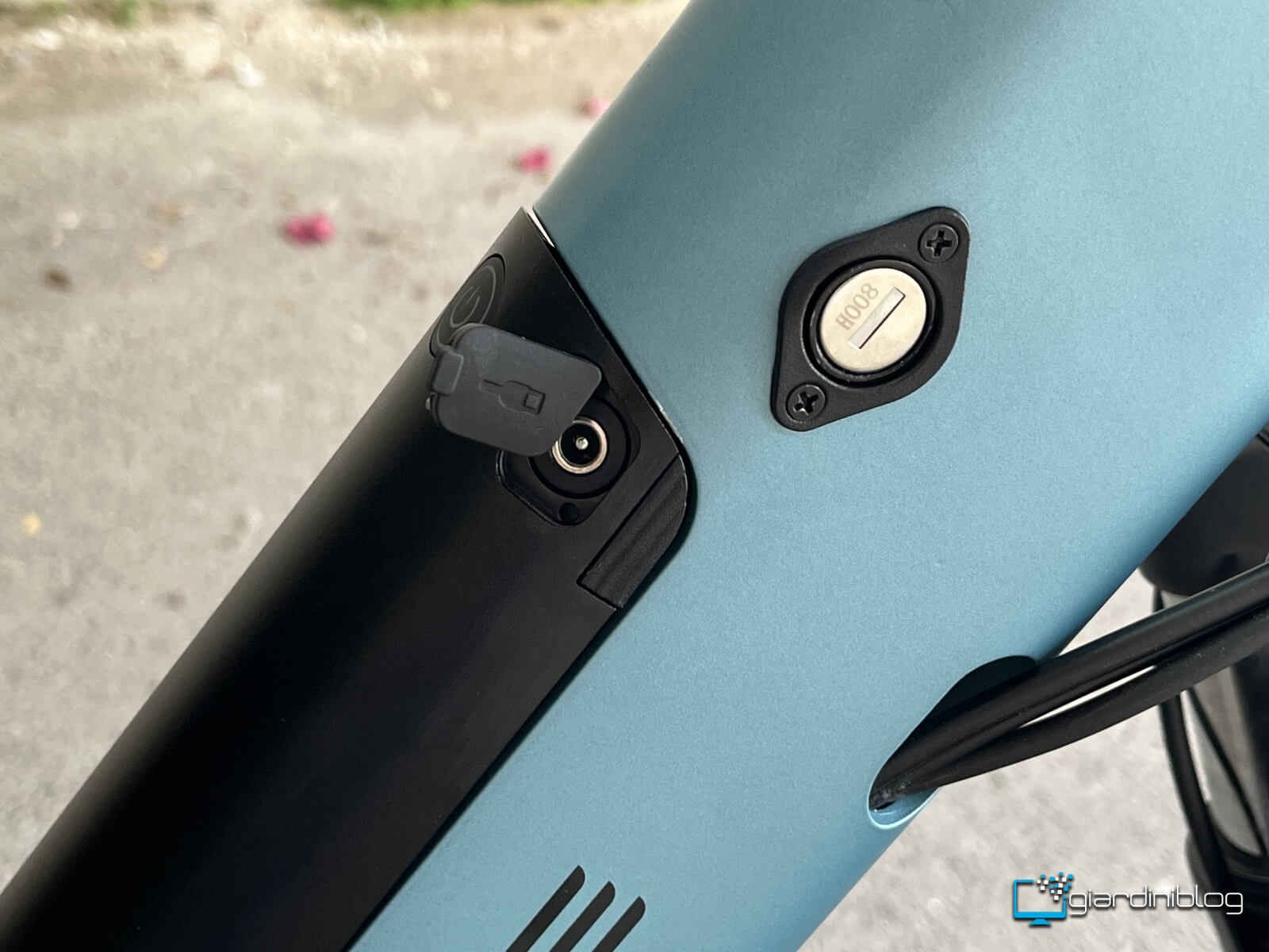 La batteria da 36V 13Ah è integrata perfettamente nel tubo sella, una soluzione che mostra continuità con il design della ebike. Le due chiavi incluse non sono un dettaglio secondario, ma una scelta pensata per la comodità di chi usa la bici ogni giorno: consentono di rimuovere e ricaricare la batteria facilmente, sia a casa che in ufficio, rendendo l’esperienza di utilizzo ancora più pratica.