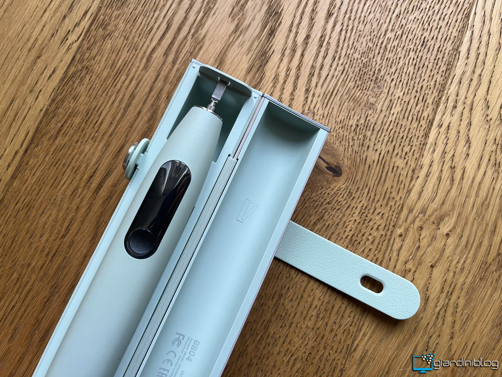 Una piacevole sorpresa è rappresentata dalla custodia inclusa, ideale per riporre lo spazzolino in modo sicuro. Realizzata in plastica, all’aspetto e al tatto ricorda la finta pelle; questa custodia presenta una trama ruvida che aggiunge un tocco di eleganza e rende il tutto “premium”. E’ dotata anche di una chiusura con un aggancio, complessivamente molto stabile.
