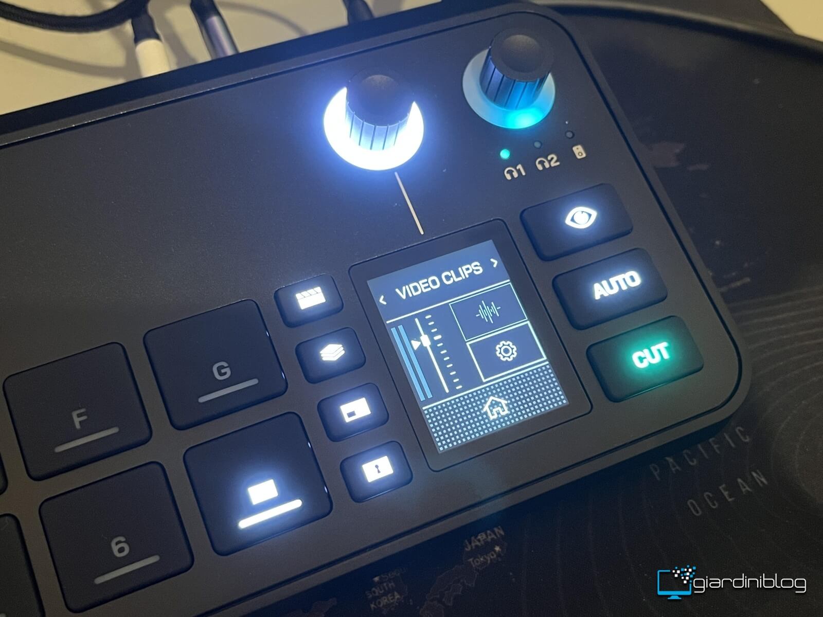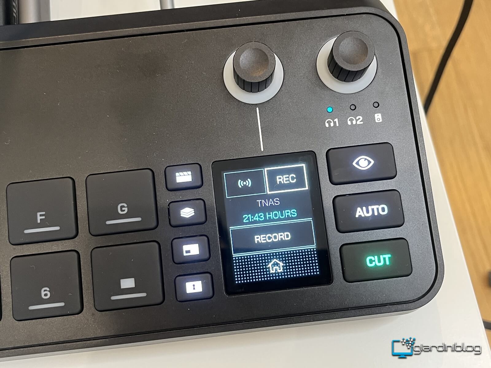 - 7 pulsanti scene (A-G) per richiamare setup pre-configurati istantaneamente con layout video, overlays, routing audio