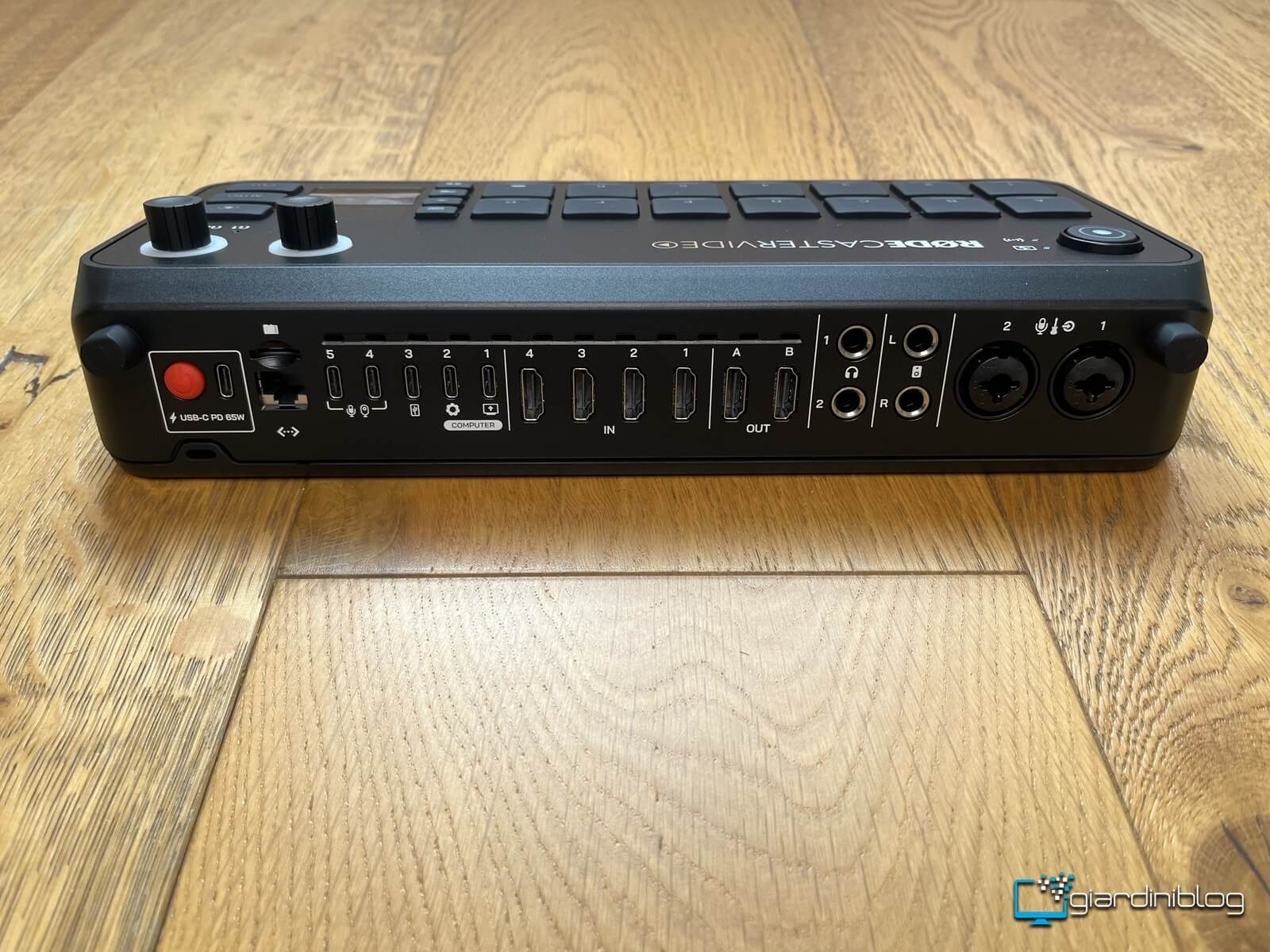 Sul retro, il Rodecaster Video ospita un’interfaccia di connessione completa per operazioni professionali: quattro ingressi HDMI (1-4) per telecamere e dispositivi video fino a 1080p60, due uscite HDMI (A e B) per output program e preview, e due porte USB-C dedicate (4-5) per webcam UVC e dispositivi audio aggiuntivi. Per l’audio sono presenti due combo jack Neutrik (XLR/6.3mm) per microfoni e strumenti, due ricevitori wireless integrati RØDE Serie IV, due uscite cuffie da 6.3mm e due uscite bilanciate L/R per sistemi di monitoring.