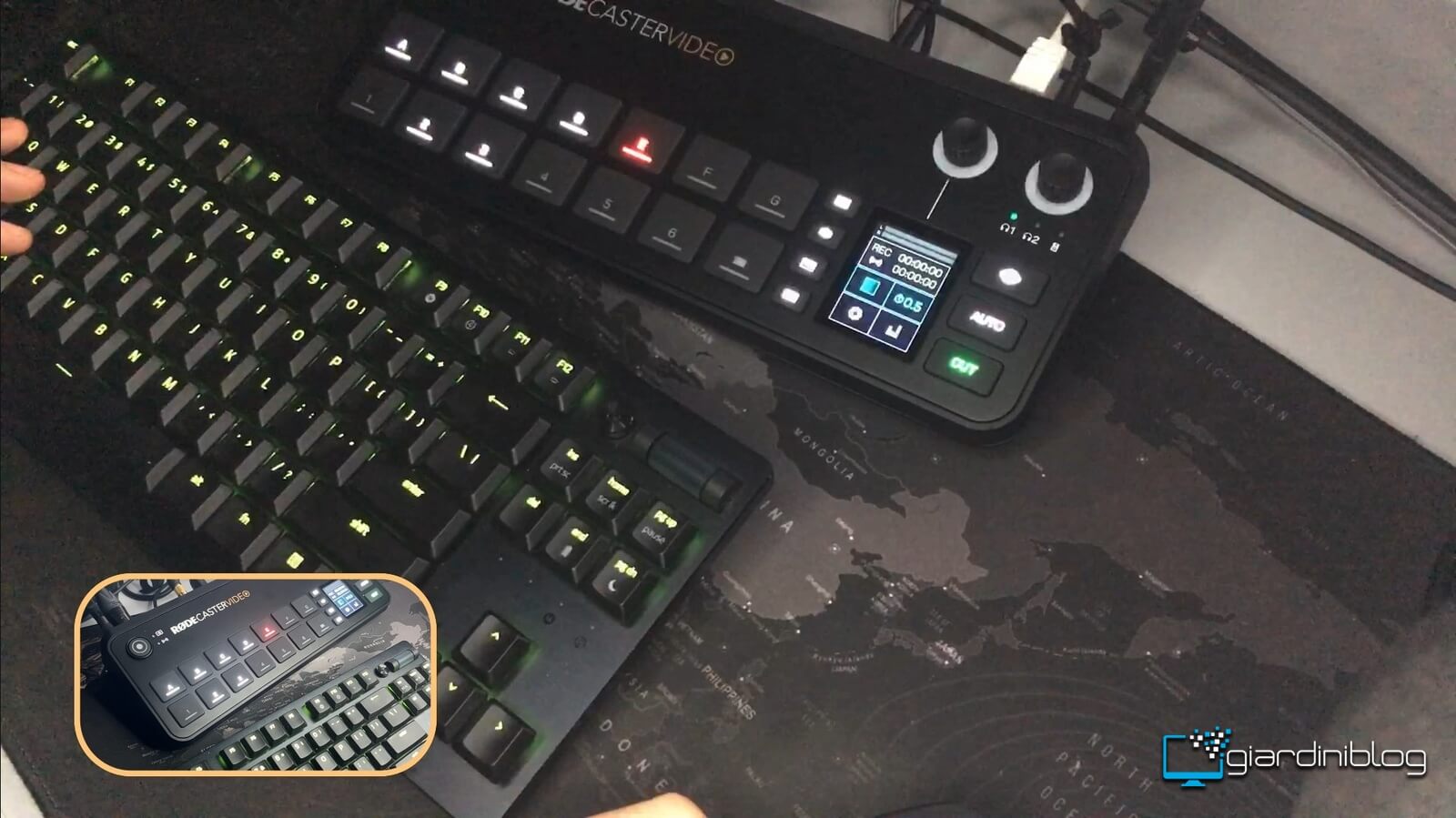 La configurazione di prova prevedeva due sorgenti video simultanee: un input HDMI collegato alla console per stream del gioco, e una camera USB-C collegata al dispositivo per inquadrare le mani in primo piano mentre controllano il joypad. L’output composito veniva visualizzato in tempo reale su un monitor collegato all’uscita HDMI del Rodecaster Video, mostrando il risultato finale già editato e switchato.