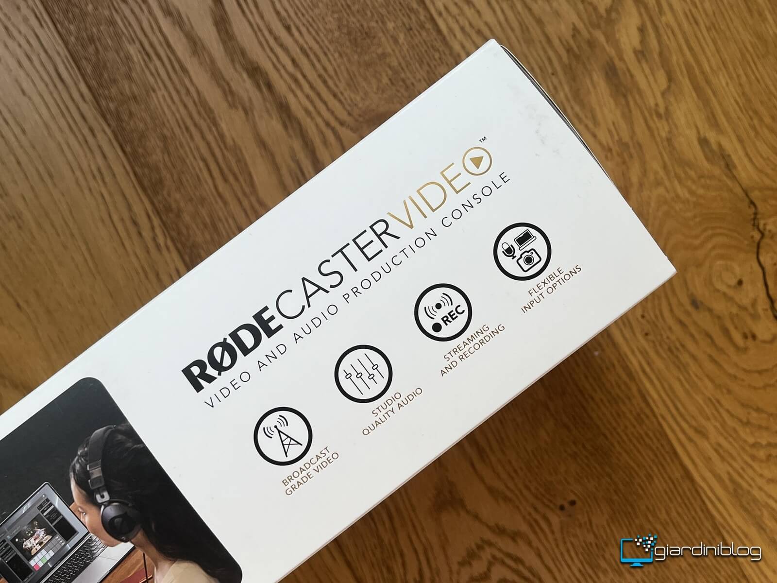 La grafica della confezione segue la palette RØDE: nero e oro su sfondo bianco, che trasmette eleganza e design ricercato; infatti la grafica è pulita e ordinata, con elementi iconografici che presentano le funzionalità principali: video switching, audio processing, streaming senza ricorrere a troppo testo. Lo stesso font è proporzionato e leggibile anche a distanza, con il nome del prodotto in evidenza e le specifiche. Il messaggio è che si tratta di uno strumento serio, usato da professionisti del settore.