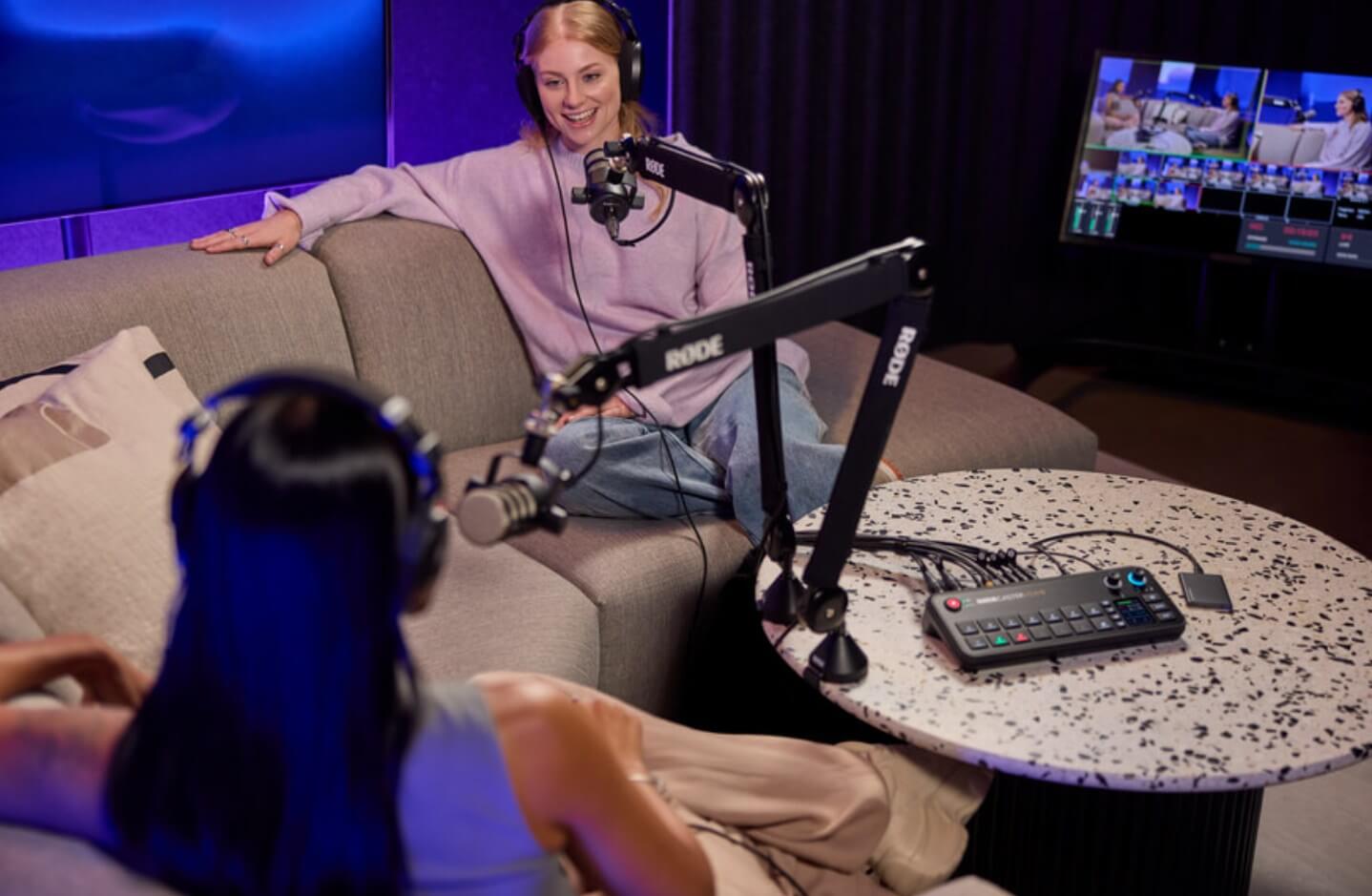 Abbiamo provato anche uno scenario diverso, dove RodeCaster Video si dimostra utilissimo grazie all’auto-switching intelligente basato su rilevamento della sorgente da cui proviene l’audio, una feature che rende di fatto automatica la regia video. Durante i nostri test, abbiamo configurato uno scenario con host e ospite, ognuno con una telecamera puntata e un microfono XLR dedicato.