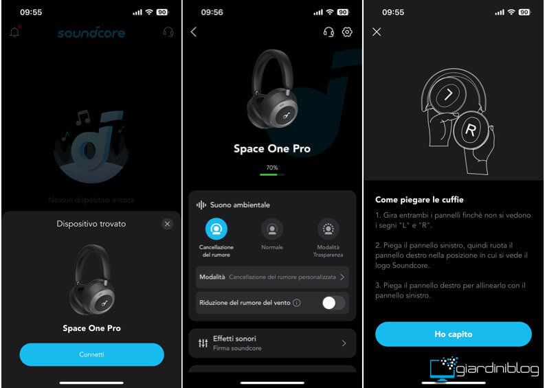 L’altra caratteristica peculiare di questo modello di Soundcore, è il sistema denominato “FlexiCurve” che permette di ripiegare i padiglioni auricolari l’uno sull’altro, in modo da ottenere un ingombro minimo quando non si utilizzano e quando dobbiamo trasportarle. Soundcore ci tiene molto a questa funzionalità di design e spiega praticamente ovunque, sia nell’app che nelle istruzioni e passando anche per i video, come ripiegarle e come farlo nella maniera più veloce ed efficace.