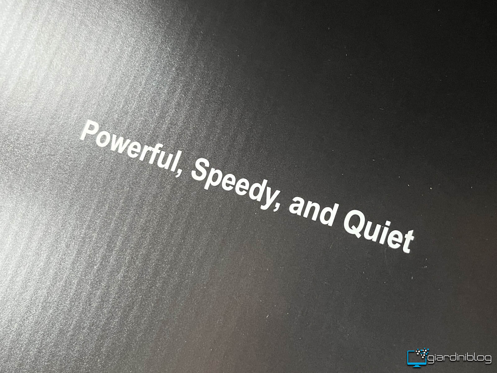 Il packaging del TerraMaster F8 SSD Plus è molto contenuto e minimale. Il nero della scatola rende il tutto molto elegante e futuristico e risalta la scritta “Powerful, Speedy and Quiet” che vuole riassumere le caratteristiche del piccolo NAS.
