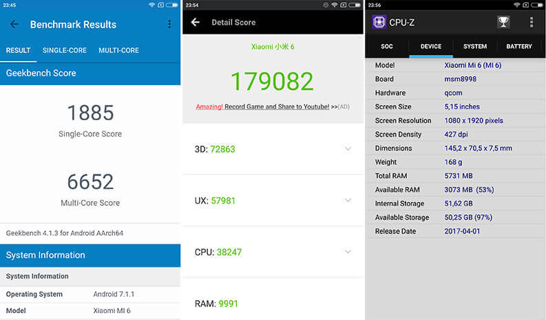Parlando di Hardware il nuovo Xiaomi Mi6 è dotato di una CPU octa-core (8 core) Qualcomm Snapdragon 835. Si tratta di un chip con processo produttivo a 10nm costruito da Samsung e Qualcomm che risulta essere il 40% più efficiente in termini di consumo energetico e quasi il 30% più performante rispetto ai predecessori. Per quantitativo di RAM, già la versione “base” (ovvero quella con disco da 64GB) è dotata di 6GB. Il sistema operativo è molto reattivo e non ha mai avuto alcun rallentamento durante le prove (leggete il paragrafo software e applicazioni per altri dettagli).