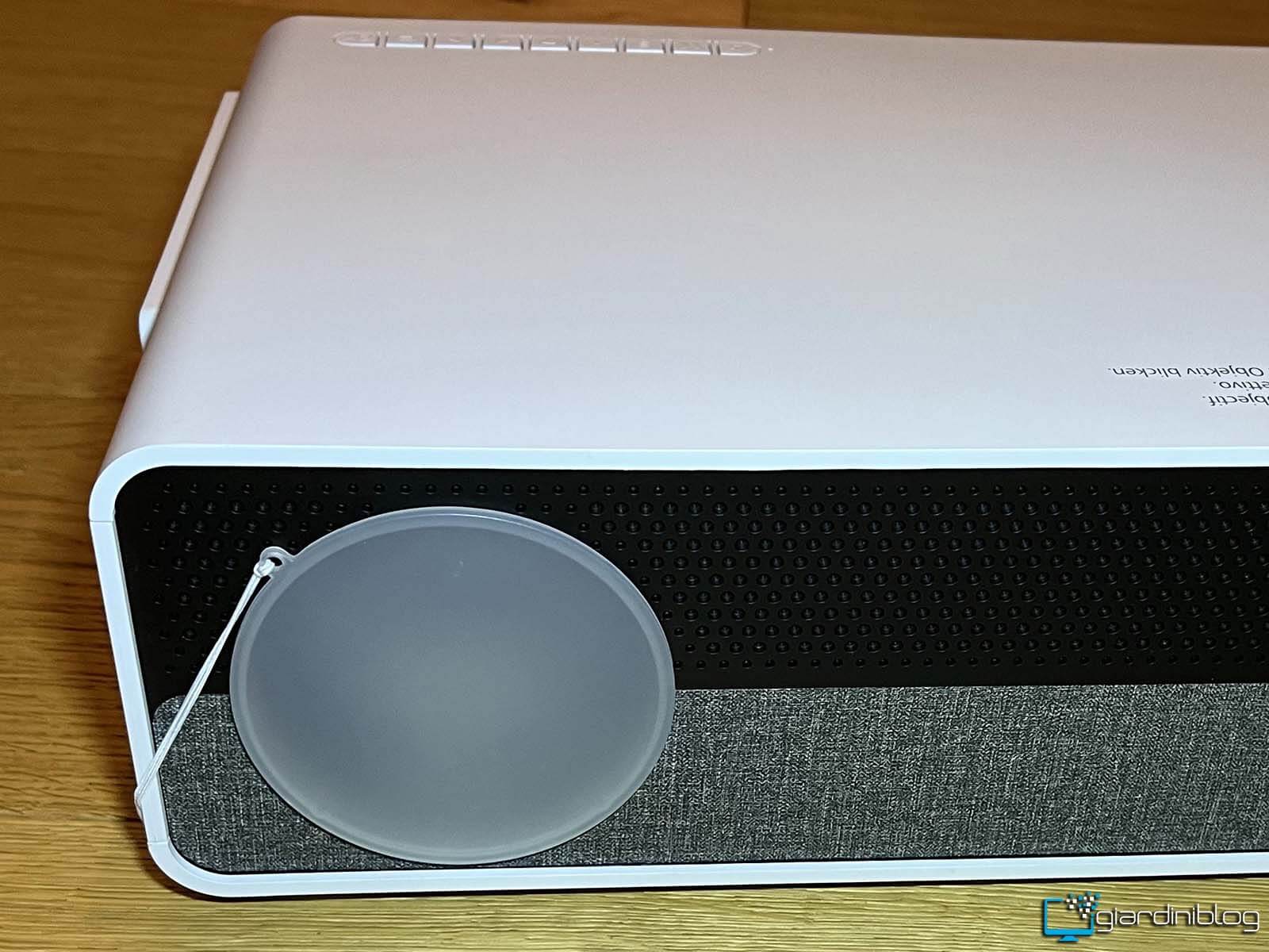 Nel lato anteriore notiamo la lente inserita in un alloggiamento, cosa che abbiamo apprezzato perché consente di spostare facilmente il proiettore senza rischiare di sporcare o mettere le mani sulla lente. La lente, è provvista anche di un coperchio protettivo, legato alla scocca.