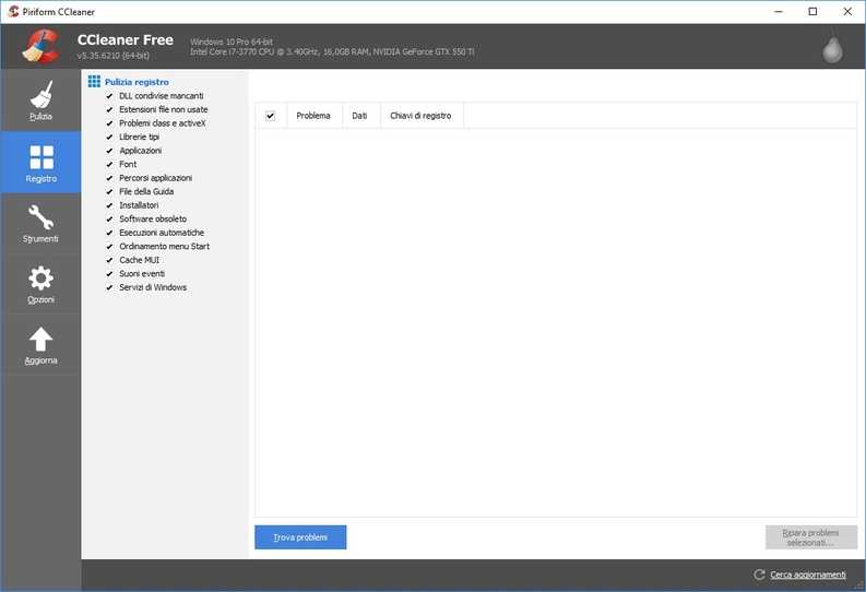 Come ripulire il PC da file spazzatura inutiliCome ripulire il PC da file spazzatura inutiliQuando ti accorgi che, senza nessun motivo apparente, il tuo fedele computer inizia ad andare sempre più lento, allora potrebbe essere il momento di ripulire il PC dai file inutili. [...]Continua a leggereAnche il registro di sistema di Windows deve essere tenuto ordinato e CCleaner offre una funzione di pulizia abbastanza sicura, basterà portarti nella sezione Registro e cliccando sul tasto “Trova problemi”, seguito dal tasto “Ripara problemi selezionati” per avviare la pulizia vera e propria.