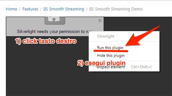 3) Da questo momento, quando dovrete visualizzare un video o altro contenuto che richiede silverlight con Google Chrome 42+ cliccate con il tasto destro sul contenuto e attivate il plugin (operazione necessaria per il corretto funzionamento).