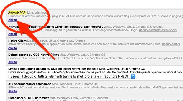 Attenzione! Come segnalato da Google Chrome stesso, l’abilitazione delle NPAPI sarà possibile solo fino alla versione 45 di Chrome, presumibilmente fino a Settembre 2015.