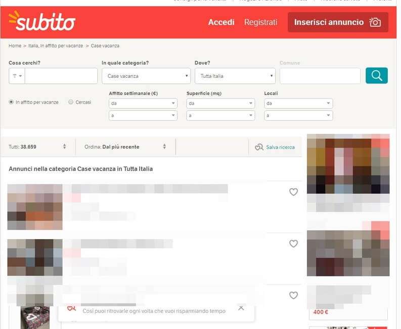 Ottimi anche i filtri disponibili in alto nella sezione dedicata, così da poter separare tutti i risultati per prezzo, numero di locali e metratura. La sezione dedicata alle case vacanze è disponibile cliccando sul link riportato sotto.