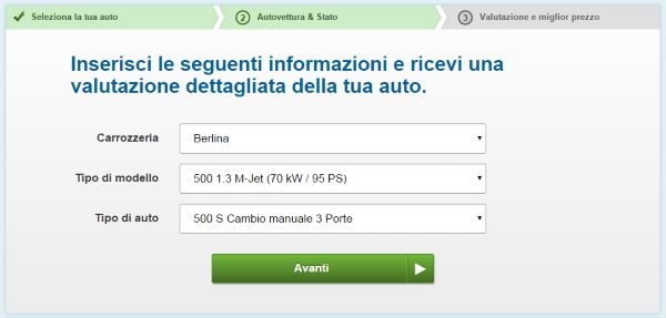 nella pagina successiva altri tre semplici dati, ovvero tipo di Carrozzeria, Tipo di modello e Tipo di auto come mostrato in esempio qui sotto. Non ci resta che cliccare su “Avanti”