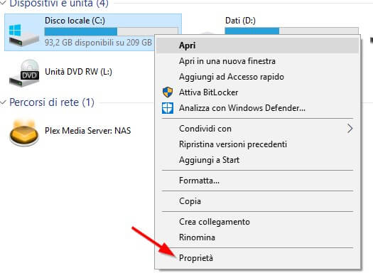 Per eseguire la funzionalità CheckDisk su Windows 10: apri Esplora risorse nella barra dei programmi e portati su Questo PC; ora fai clic con il tasto destro del mouse sul disco di sistema (:C) e seleziona la voce “Proprietà”.