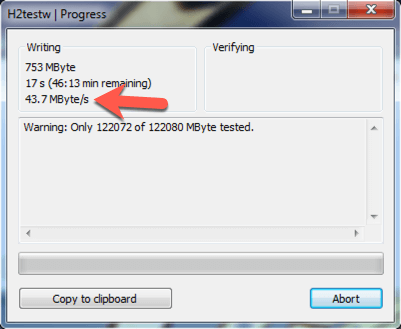 H2testw è un tool affidabile, utilizzato da anni per la verifica dell’originalità di memorie flash. Funziona perfettamente anche per testare penne USB. Si tratta di un programma molto lento perché scrive su tutto lo spazio di memoria disponibile e legge di nuovo indietro quello che ha scritto (1GB per volta) senza usare particolari accorgimenti usati invece sui programmi moderni per completare il test in meno tempo. Ovviamente la velocità dipende anche da quella della scheda SD che si sta testando.