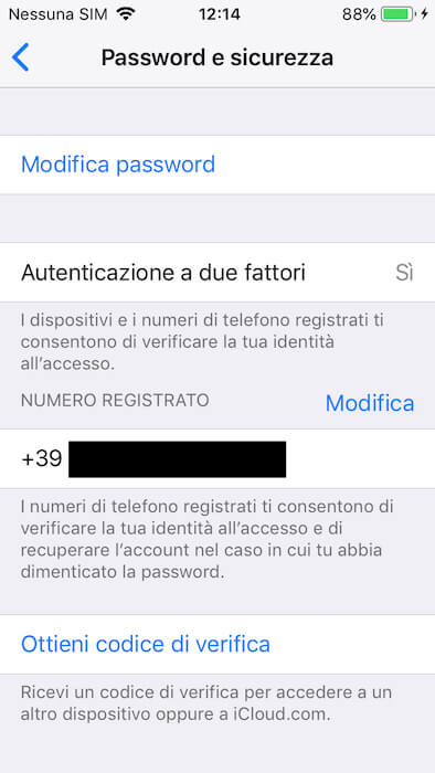 Prima di avviare la rimozione dell’ID Apple, assicurati di abilitare l’autenticazione a due fattori e il codice. In caso contrario, l’iPhone potrebbe rimanere bloccato. Per verificare che l’autenticazione a due fattori sia attiva, apri l’app “Impostazioni“, quindi tocca il tuo nome (ID Apple), seleziona la scheda “Password e sicurezza” e nella nuova pagina accertati che accanto alla voce “Autenticazione a due fattori” ci sia “Sì”.